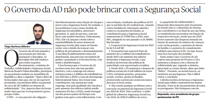 O Governo da AD tem pautado a sua actuação por inacção, usurpação e desculpas. As desculpas têm sido muitas e para todos os gostos. Recentemente, a Ministra do Trabalho, Solidariedade e Segurança Social, Maria do Rosário Palma Ramalho, participou na sua primeira audição na Assembleia da República e disse o seguinte: «Quero dizer de forma muito clara que, em vez do superavit prometido, encontrámos défice orçamental de cerca de 287 milhões no sistema de solidariedade». Ora, importa dizer de forma muito clara que isto é irresponsável e grave, porque é falso.