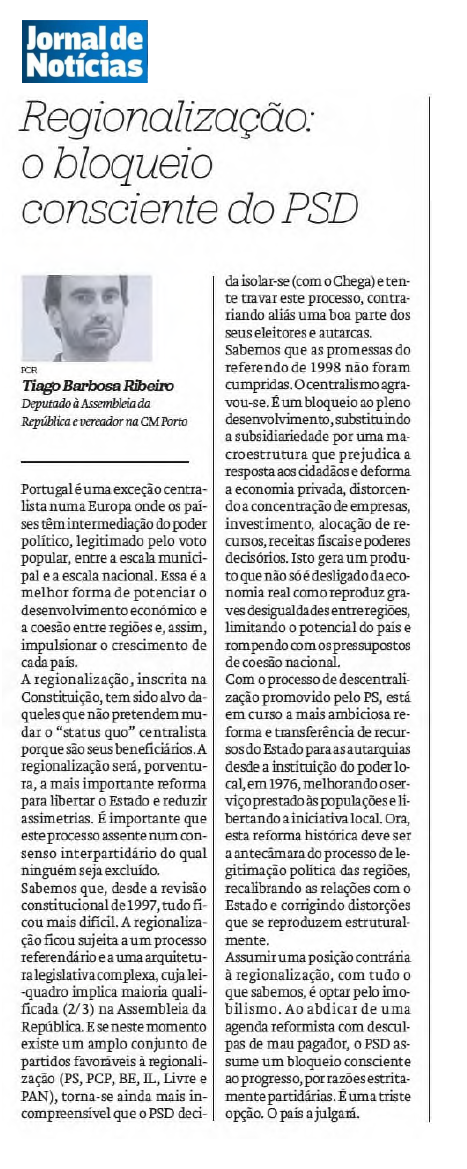 Assumir uma posição contrária à Regionalização, com tudo o que sabemos, é optar pelo imobilismo. Ao abdicar de uma agenda reformista com desculpas de mau pagador, o PSD assume um bloqueio consciente ao progresso, por razões estritamente partidárias. É uma triste opção. O país a julgará.