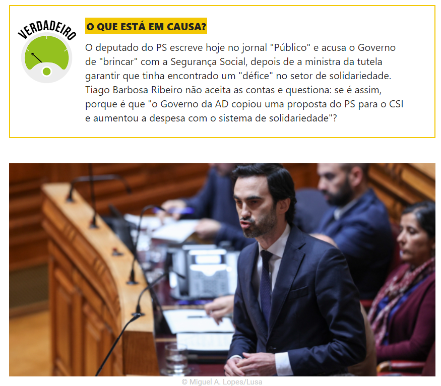 Peça do «Polígrafo» sobre as declarações de Tiago Barbosa Ribeiro a propósito do Governo copiar propostas do PS para o Complemento Solidário para Idosos.